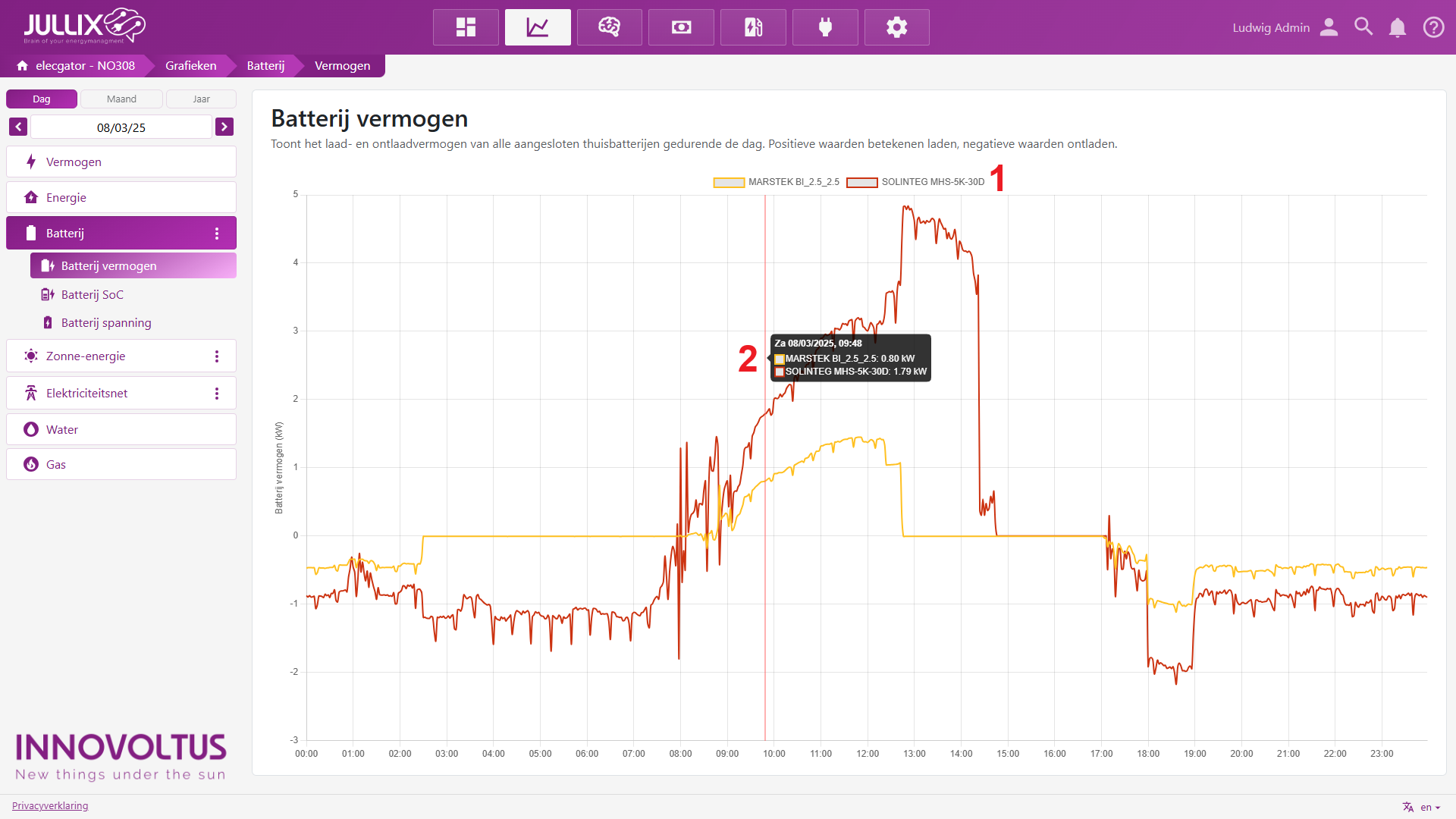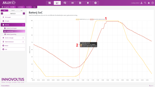 Met de muiscursor kan je over de grafiek bewegen om de SoC waardes van de verschillende batterijsystemen in een tooltip te bekijken (2).