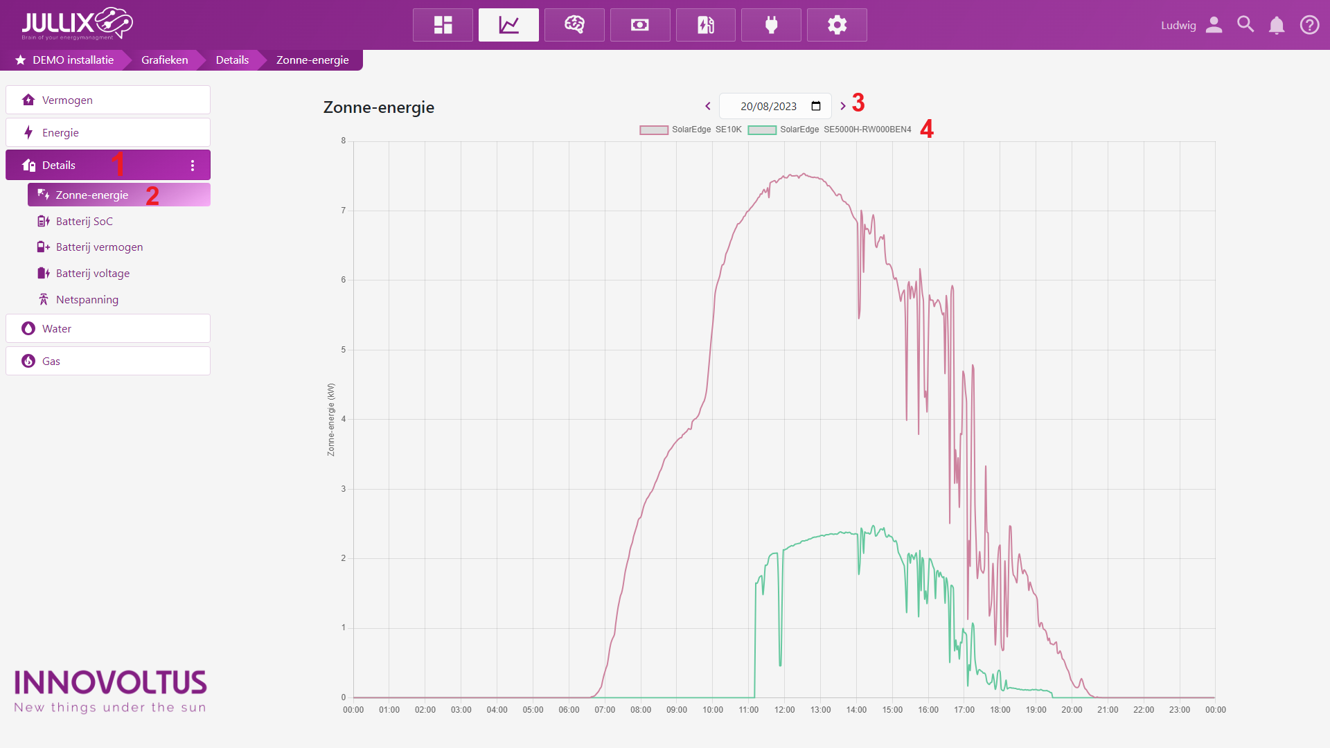 In het Grafiek menu heb je de Detail-grafieken (1). Met daaronder een vijftal grafieken(2) die meer vertellen over de toestand van het net, de PV-omvormers en de Batterij-omvormers. Het Jullix energie management kan meerdere PV-omvormers, hybride-omvormers en retrofit-omvormers van verschillende merken tergelijkertijd aansturen en monitoren(4). Je ziet in eerste instantie de grafiek telkens van de laatste 24 uren, je kan de grafiek van andere dagen ook bekijken via het datum selectie (3).