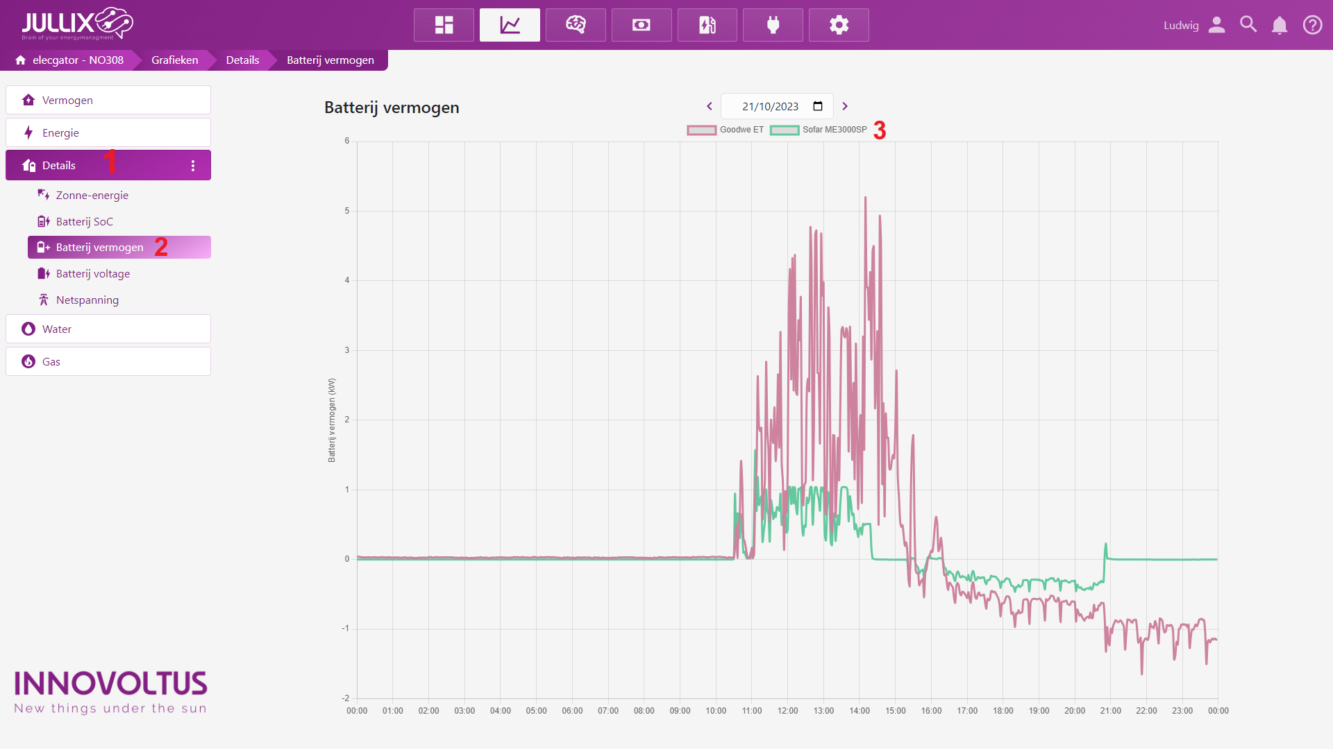 De grafiek van het Batterij vermogen(2) toont het vermogen(kWh) waarmee de batterij van de aangesloten hybride- en retrofit-omvormers geladen of ontladen wordt. De batterij-omvormers krijgen ieder een andere kleur (3). Door te klikken op de legende kan je een omvormer grafiek verbergen of tonen.