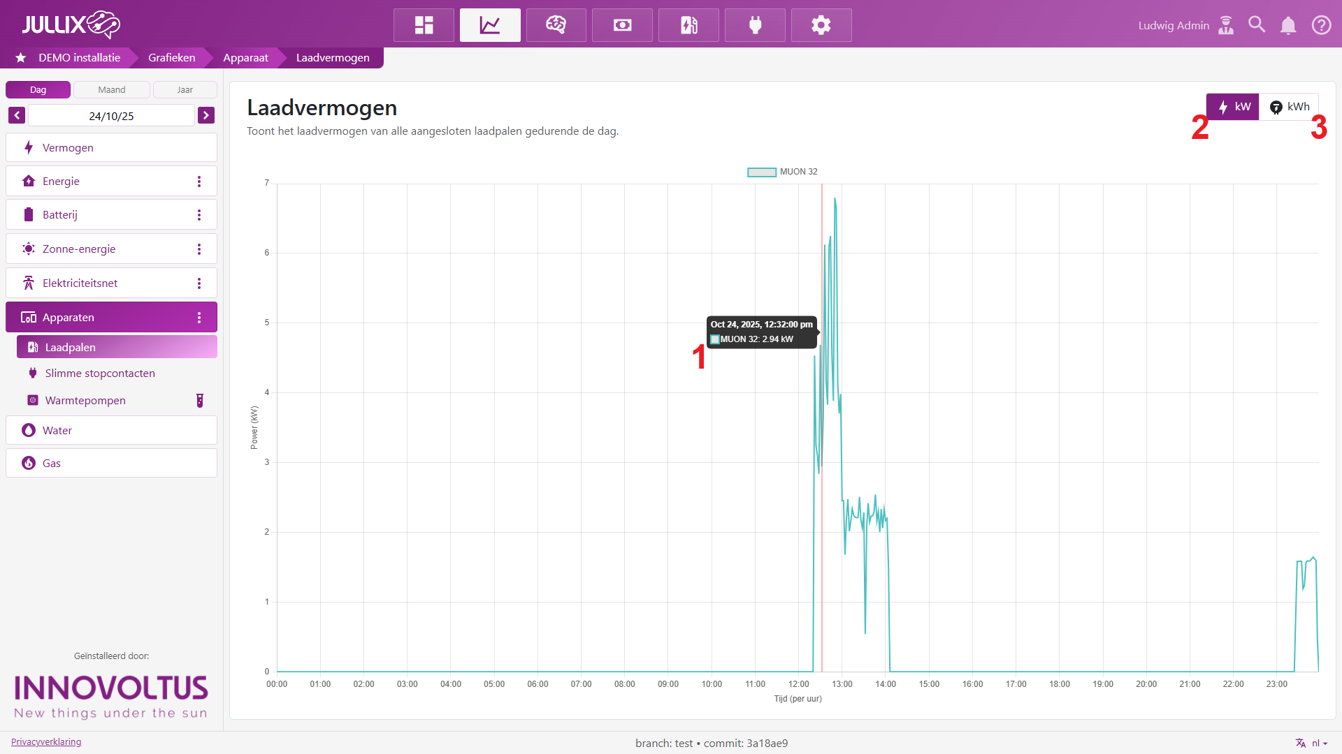 In grafieken van de Laadpalen kan je de vermogen(kW) (2) of kan je de energie(kWh) (3) grafiek van de geconnecteerde laadpalen zien. Als er meer dan één laadpaal is krijgt elke grafiek een andere kleur. Door te klikken op de legende kan je een grafiek verbergen of weergeven.