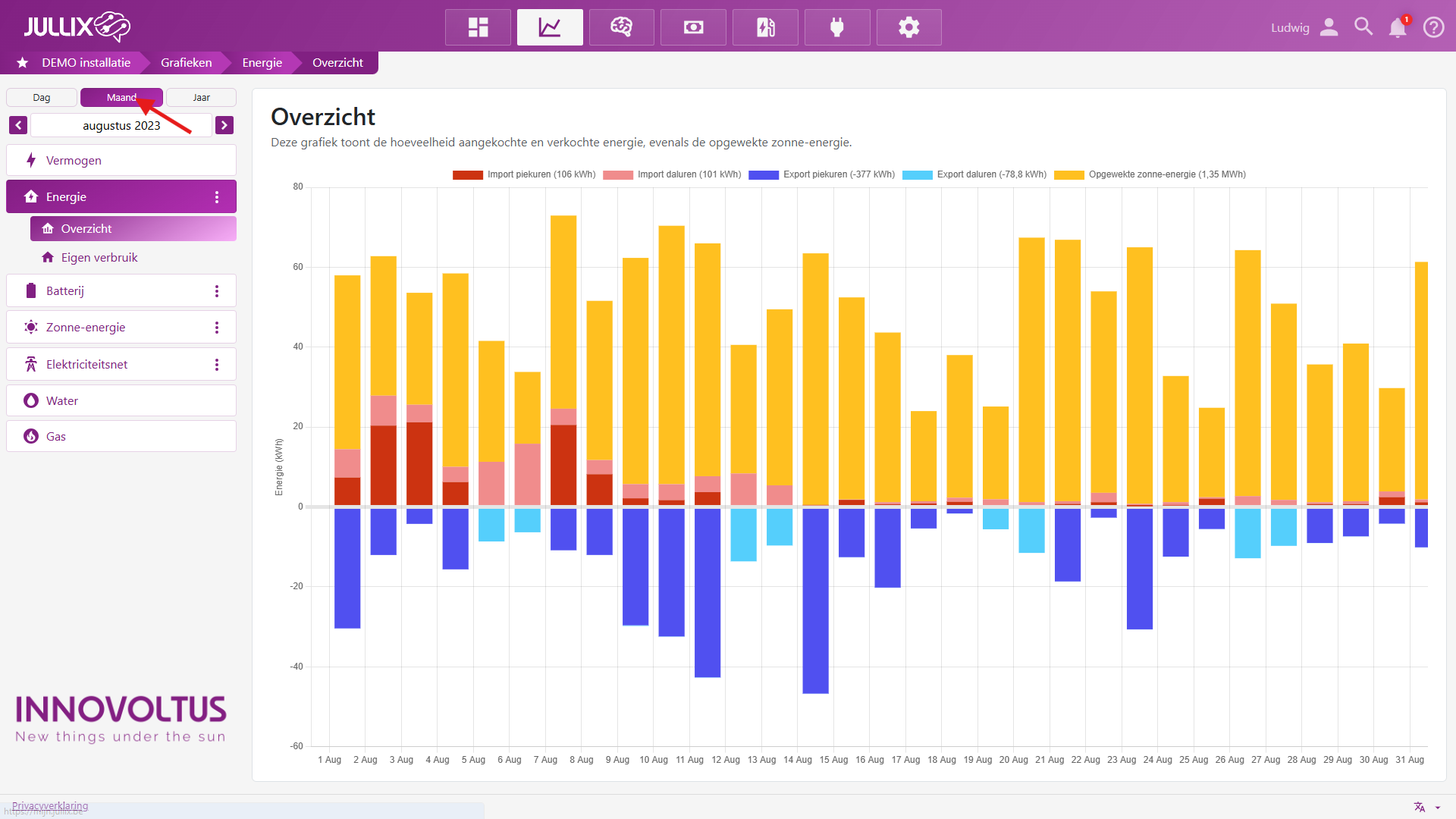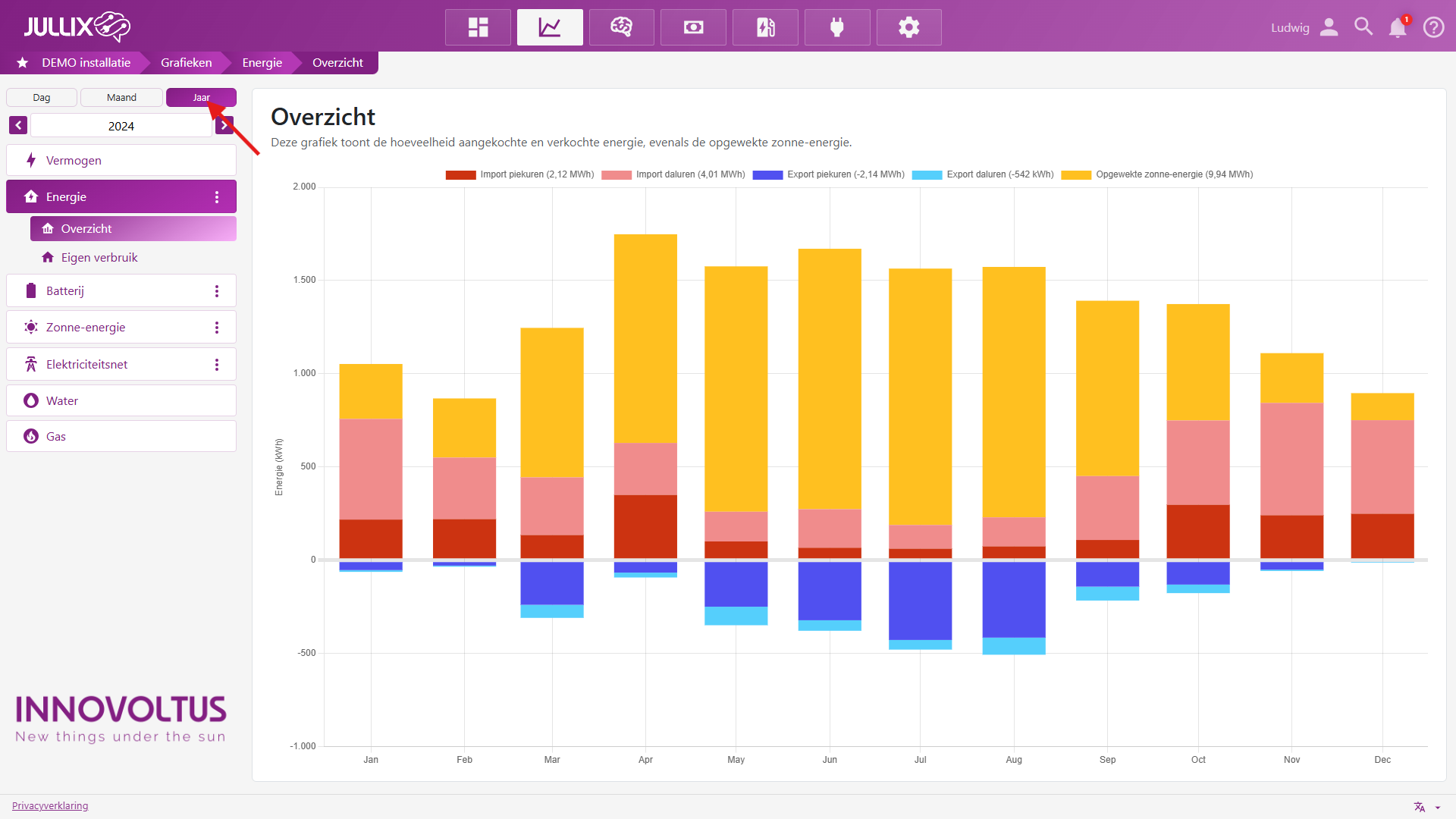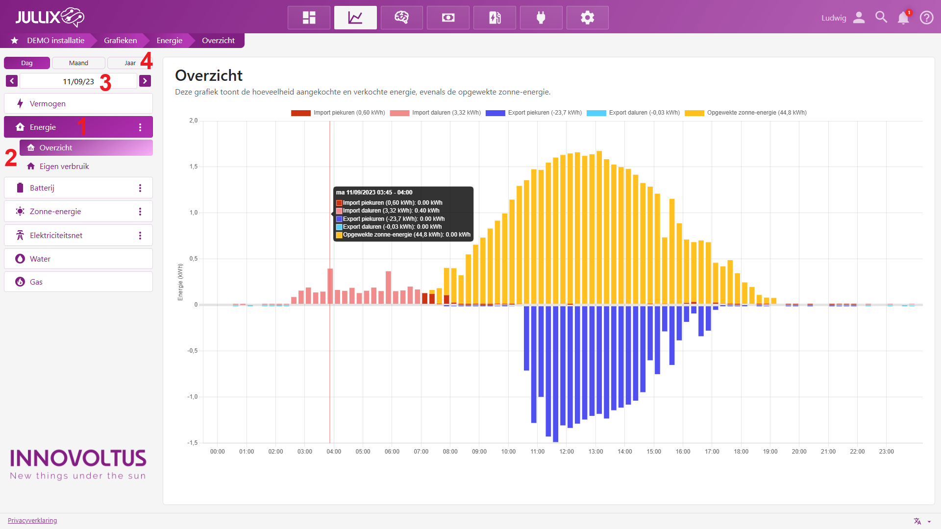Onder Energie vind je verschillende grafieken (2) van de installatie.