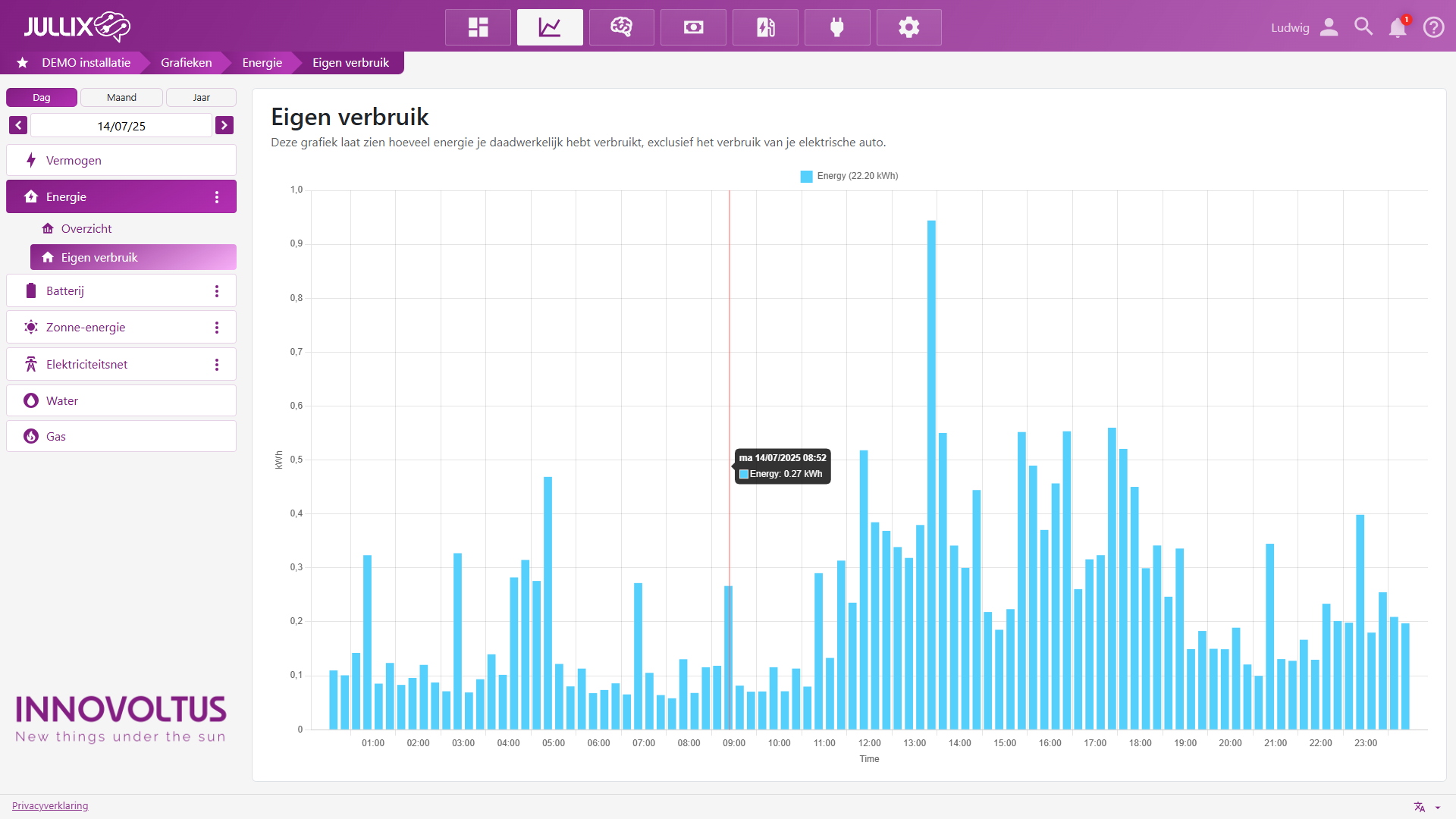 Let op: de weergave is een balkgrafiek met de energie in kWh per kwartier voor de gekozen dag. Via de kalender (3) kun je andere datums selecteren en bekijken.