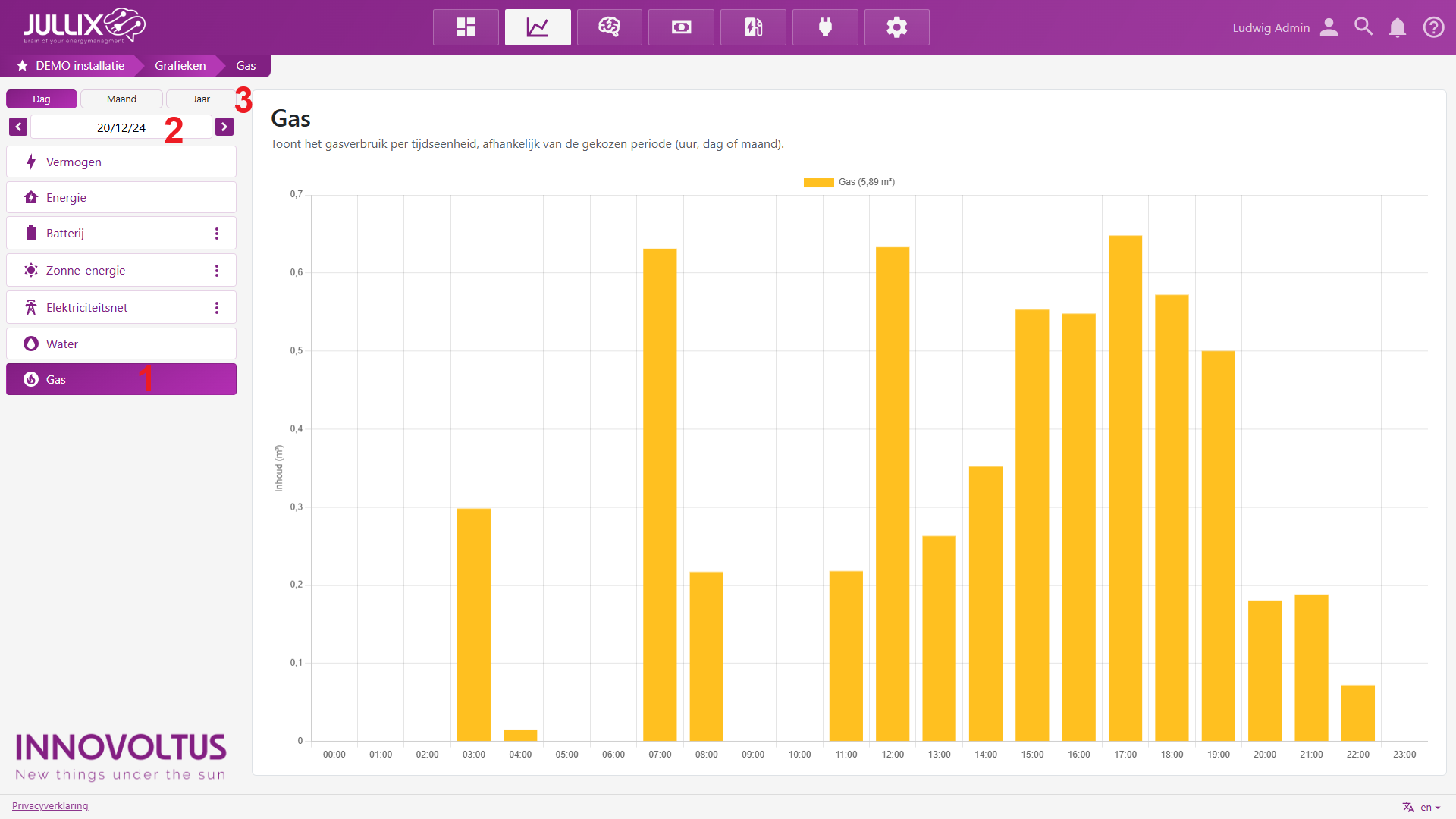 Je ziet in de grafiek telkens de geselecteerde dag, via de datum-kiezer (2) kan je ook andere dagen bekijken.