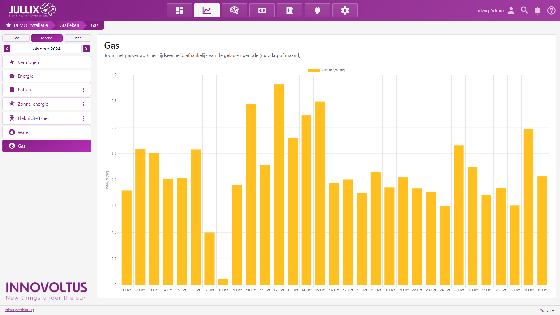 De digitale meter geeft ook de informatie van de digitale gasmeter als die aangesloten is. Als de info van de digitale gasmeter beschikbaar is in de digitale meter van Fluvius, zal Jullix deze data ook weergeven op het platform.