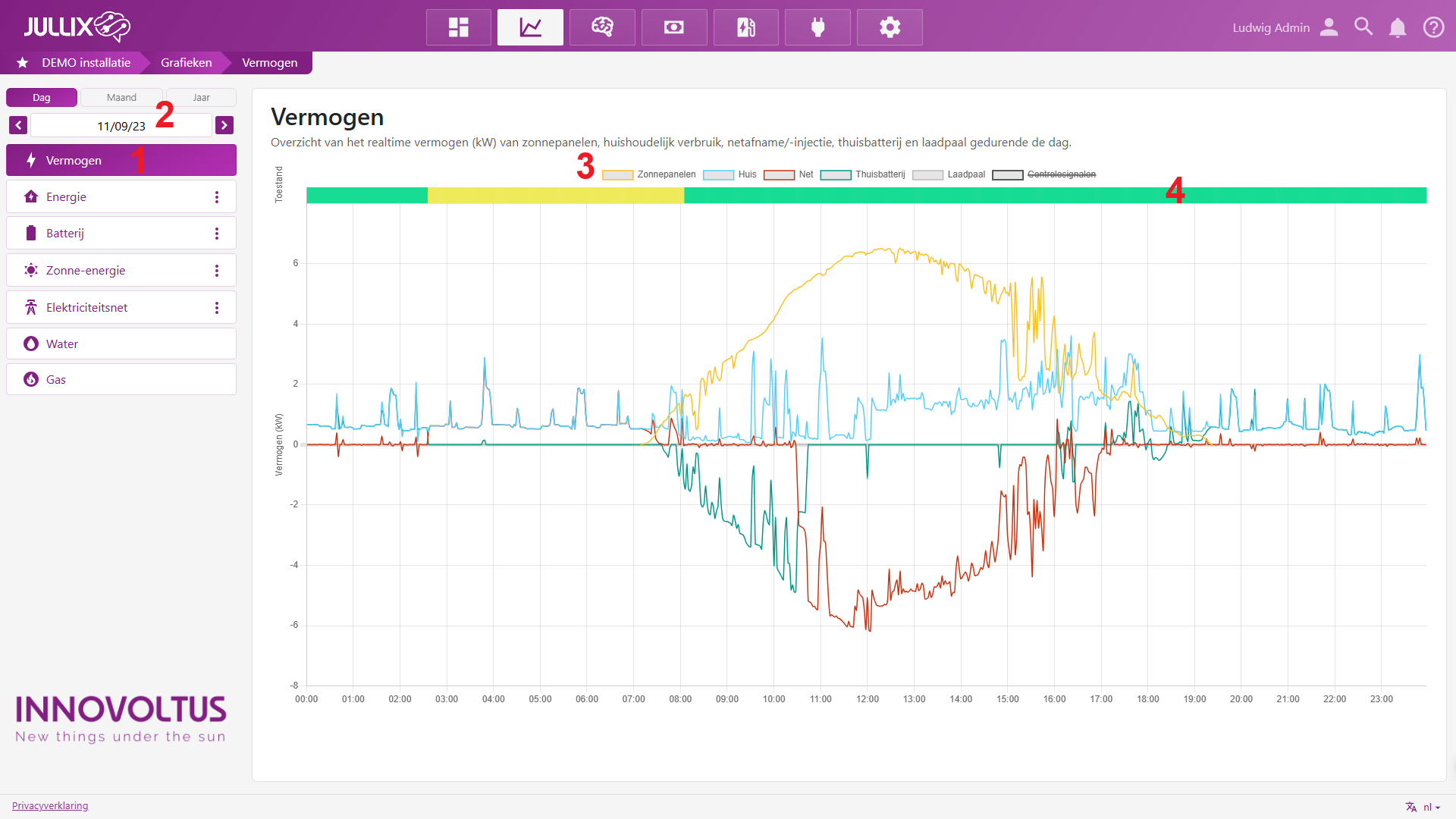 In deze grafiek zie je het vermogen van de verschillende componenten van de installatie gedurende de dag. Via de kalendernavigatie (2) kun je ook andere dagen bekijken.