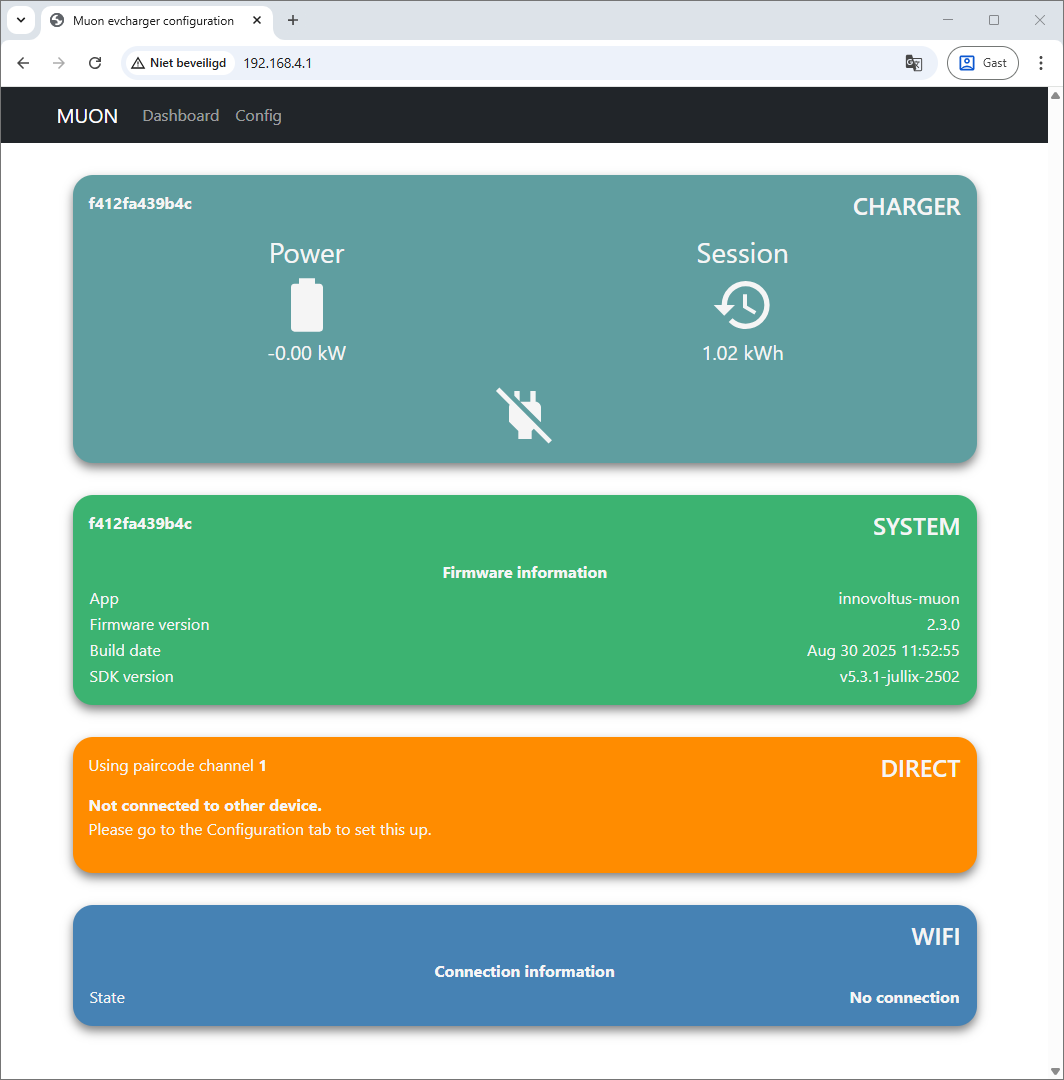 Als je verbinding hebt met de Muon laadpaal open je een browser op je smartphone of laptop en voer je het webadres in: http://192.168.4.1