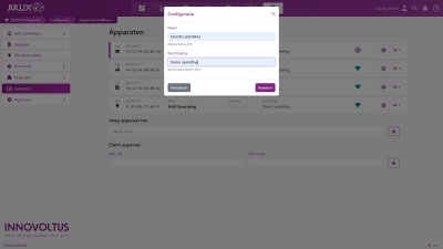Apparaten die fysiek geïnstalleerd zijn moeten ook toegevoegd worden aan de installatie op het portaal. In eerste instantie is dat de Jullix, maar ook de andere apparaten moeten op dezelfde manier toegevoegd worden. Een apparaat (Jullix, extender, enz) aan de installatie toevoegen gebeurt in 2 stappen. Eerst moet je op het portaal van de installatie bij configuratie (1), apparaten(2) het apparaat claimen. Dit doe je door bij Claim apparaat bij MAC-id het ID in te geven van het apparaat (3) bij POP-code(4) geef je de code in die je terug vindt op de stikker. Door te klikken op het plusteken(5) wordt het MAC-ID en de POP-code gecontroleerd en is het apparaat geclaimd.