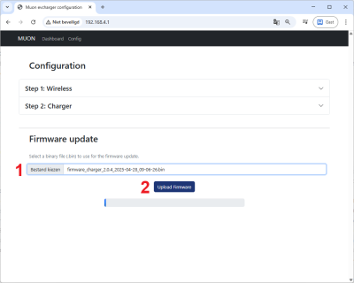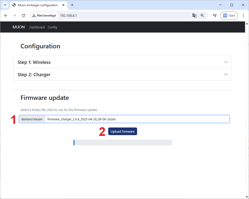 Onderaan de config-pagina vind je de Firmware update dialoog. Je klikt op de knop Bestand kiezen (1) om het bestand op je smartphone of laptop te kiezen. Vervolgens klik je op Upload Firmware (2) om de firmware te updaten.