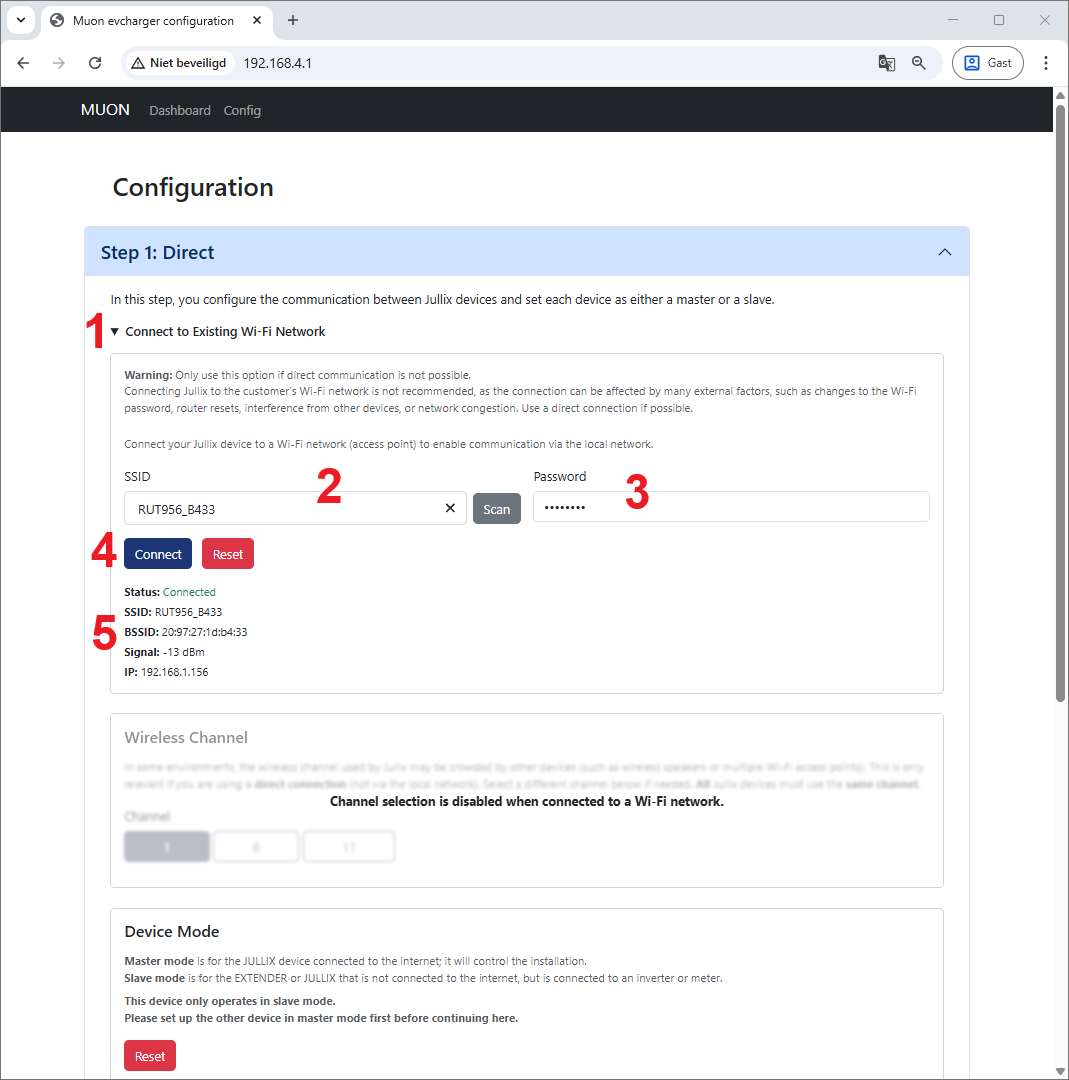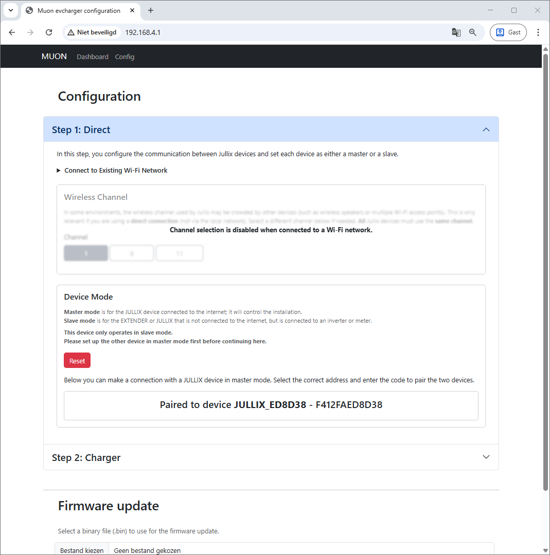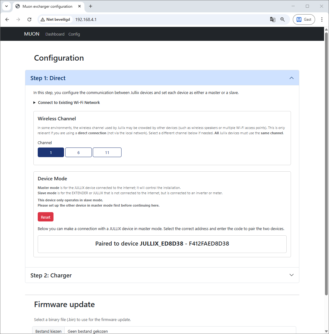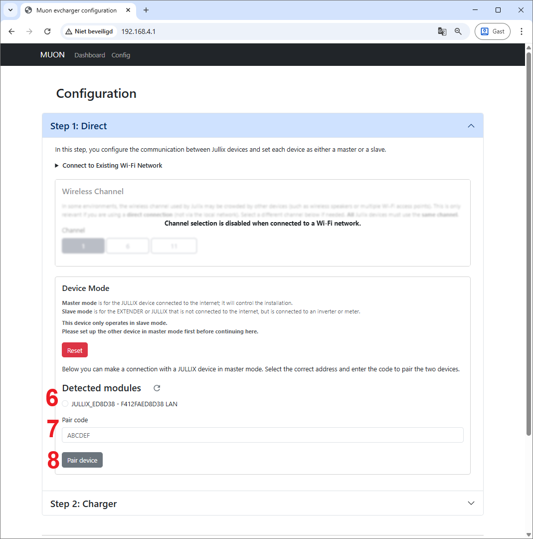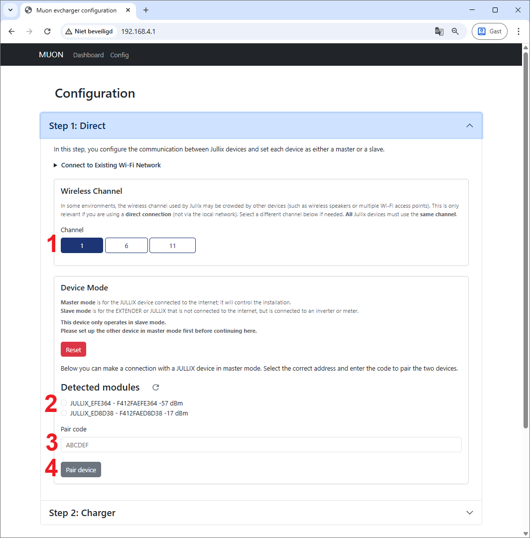 Via Step 1: Direct verbind je de Muon draadloos met de Jullix Master. Voordat je de Muon kan verbinden moet je dus zorgen dat je de paircode van de Jullix waarmee je wil verbinden bij de hand hebt. Als je de paircode hebt kan je de verbinding maken.