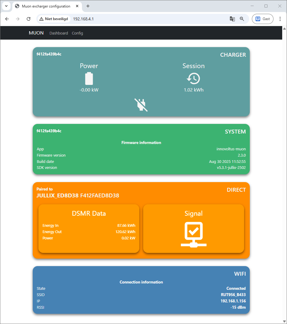 Je kan dit ook controleren op het dashboard van de Muon. In de Muon status zie je de verbinding naar de Jullix, en zie je ook het wifi netwerk waarmee geconnecteerd is.