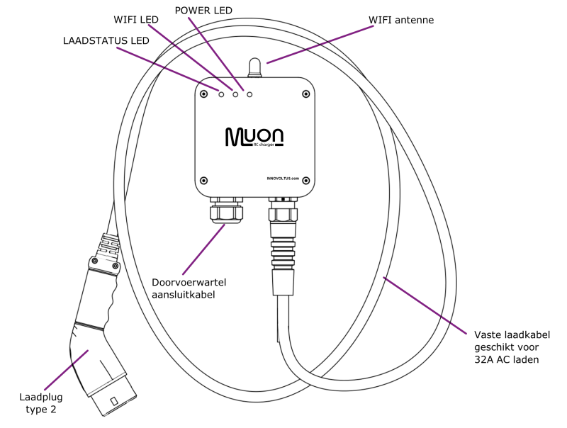 De Muon is een AC-laadpaal. De laadpaal kan 1-fasig of 3-fasig aangesloten worden. De maximum stroomsterkte die de laadpaal kan schakelen is 32A, er vanuit gaande dat de installatie daarvoor is voorzien. In een enkelfasige installatie kan een EV met een maximum vermogen van ca 7,68 kW geladen worden. Bij een 3-fasige installatie kan er met een maximum vermogen van 23 kW geladen worden. Met welk vermogen er effectief geladen wordt, is afhankelijk van de gekozen laadmodus. Als de laadpaal 3-fasig aangesloten is, kan het Jullix EMS automatisch schakelen tussen 1- en 3-fasig, afhankelijk van het gevraagde vermogen. Let wel: dergelijke omschakeling wordt niet door elke wagen ondersteund.