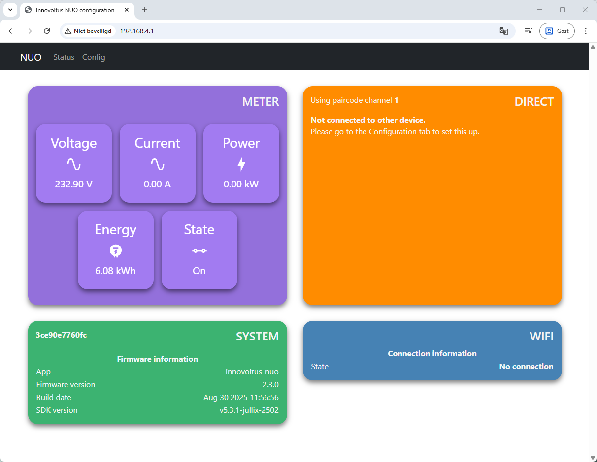 Vervolgens open je de browser en voer je het adres http://192.168.4.1 in, de statuspagina van Nuo wordt geopend.
