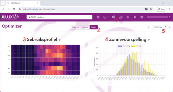In het detailsvenster(2) zie het Gebruiksprofiel (3) en de voorspelling van de opbrengst van de zonnepannelen; Zonnevoorspelling (4) van de installatie.