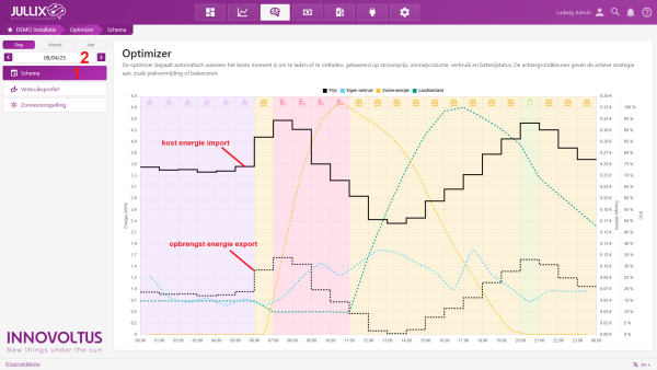 Via de Optimizer knop in het portaal kan je de Jullix Optimizer monitoren. Het Schema 1 toont wat de Jullix optimizer de komende 24 uur zal doen. Via de kalender 2 kan je ook andere dagen bekijken. Je kan maximum 24u op voorhand kijken, afhankelijk van de beschikbaarheid van de day-ahead prijzen.