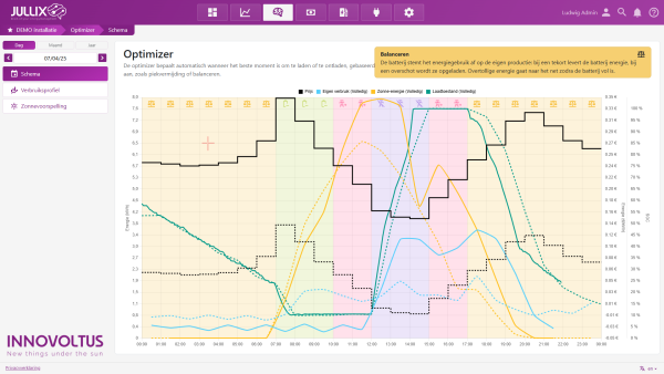 De stippellijn in de grafiek wordt vervangen door een volle lijn zodra er reële data beschikbaar zijn. Door te klikken in de legende 3 kan je van de verschillende energiegrafieken, de voorspelde gegevens en de werkelijke gegevens tegelijk laten zien. Zo zie je exact wat de Jullix Optimizer heeft gedaan.