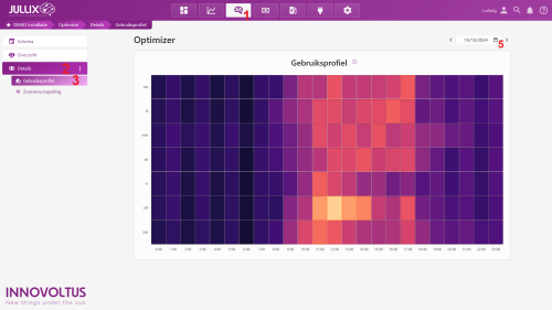 Het Gebruiksprofiel bestaat uit een raster van 24×7 blokjes, voor elk uur van de week één blokje. Hoe donkerder het blokje hoe lager het verbruik, hoe lichter het blokje hoe hoger het verbruik. Als je met de muis over de blokjes beweegt krijg je de effectieve waar de zien in de tooltip.