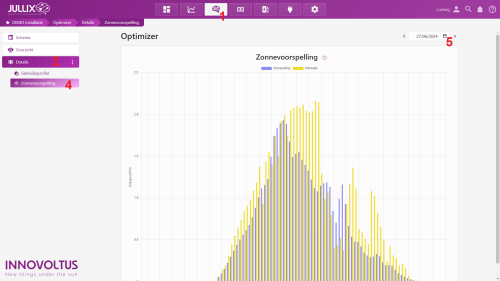 Bij Details (2) zie je het Gebruiksprofiel (3) en de voorspelling van de opbrengst van de zonnepannelen; Zonnevoorspelling (4) van de installatie.