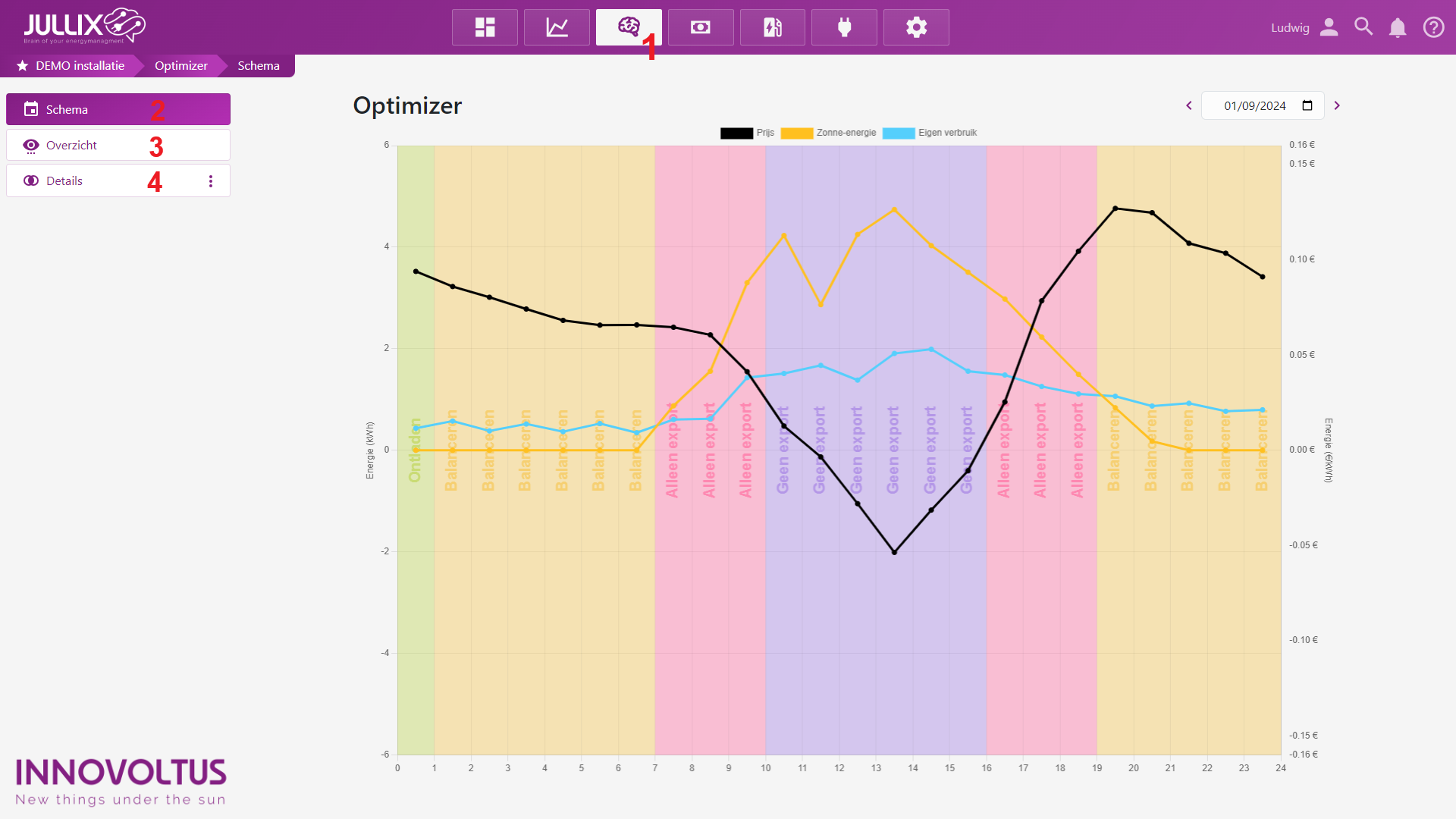 Bij Schema (3) zie je wat het Jullix EMS zal doen de komende 24 uur.
