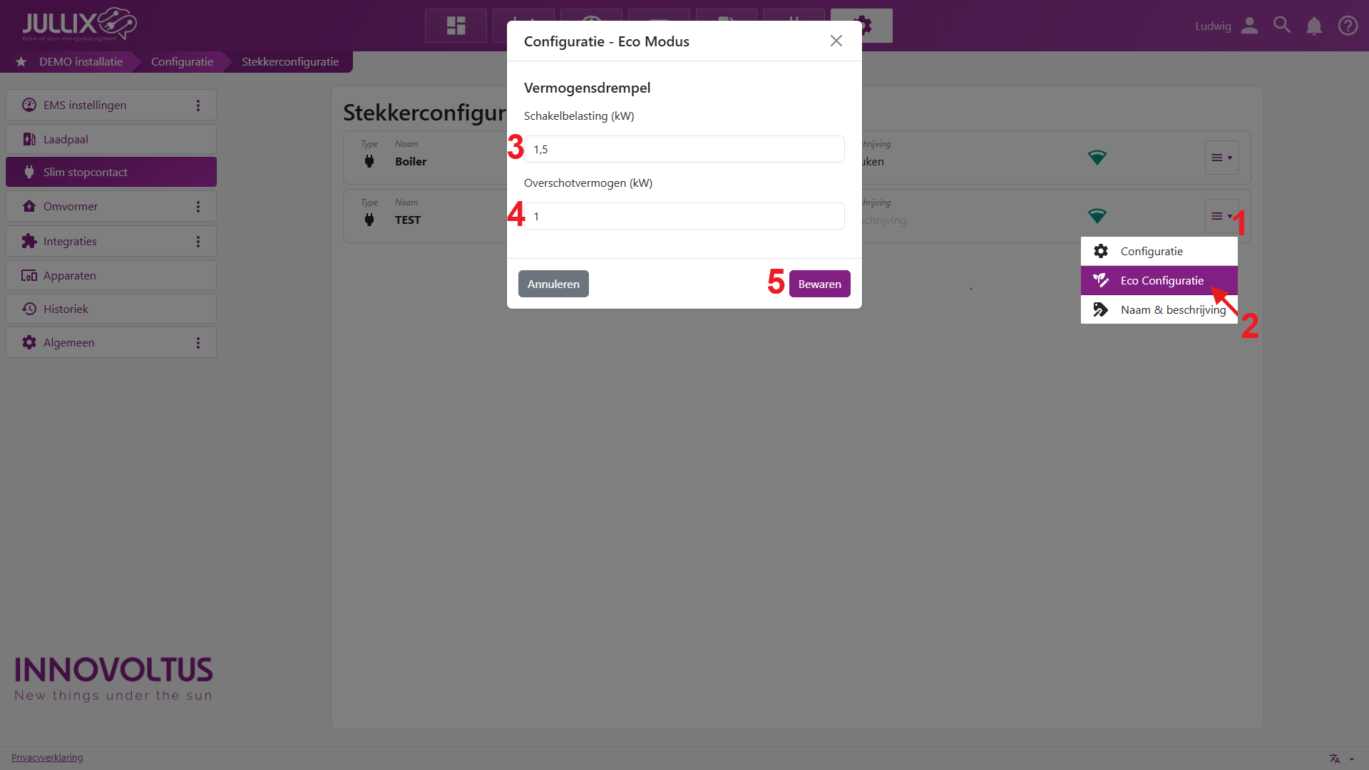 Wanneer je de eco modus kiest, moet je nog instellen wanneer het stopcontact in- en uitschakelt. De instelling 'Schakelbelasting' (3) is het vermogen dat door het inschakelen van het slimme stopcontact gebruikt zal worden. De instelling 'Overschotvermogen' (4) bepaalt hoeveel overschot er moet zijn bij export opdat het stopcontact zou inschakelen. Het slimme stopcontact zal uitschakelen wanneer het vermogen van het net zakt onder het Overschotvermogen-Schakelbelasting.