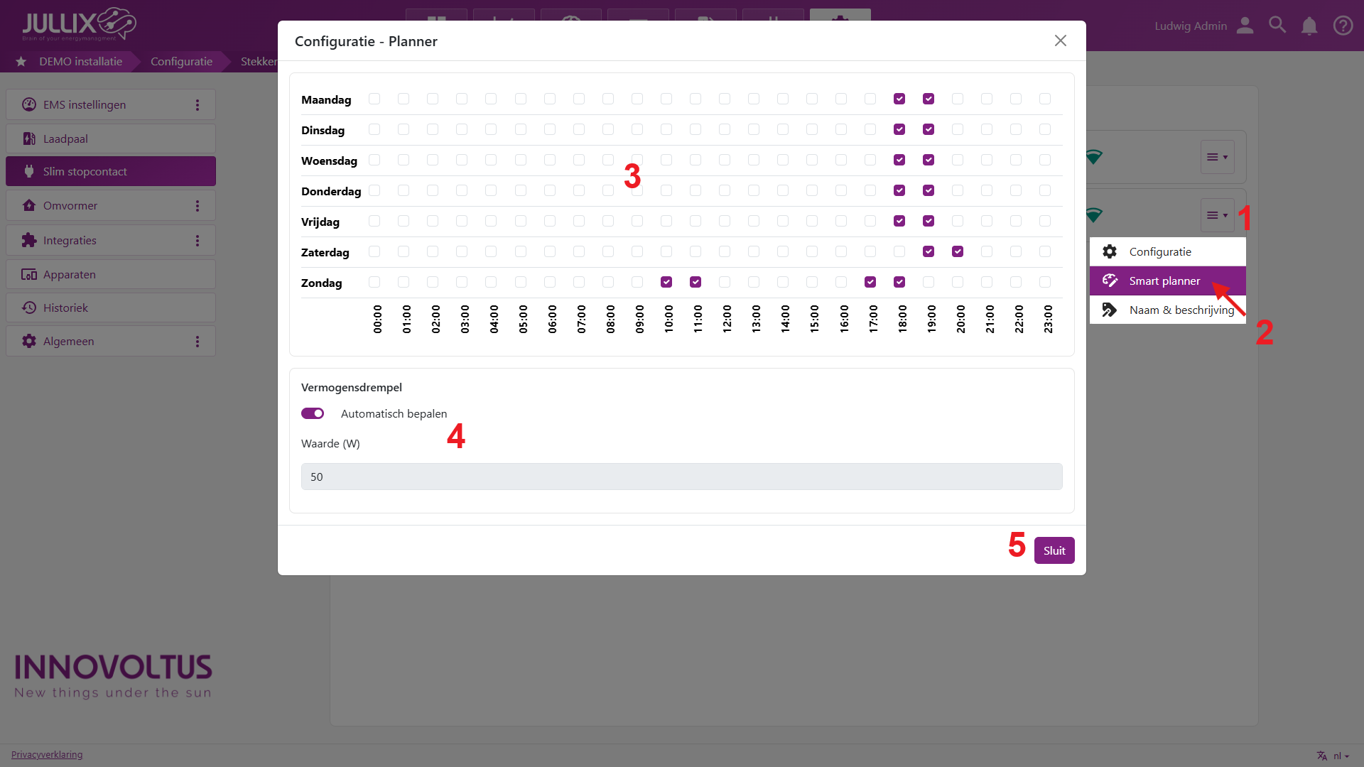 Je kan de smart-mode ook als timer gebruiken. Je stelt het sluimer verbruik hoog in vb 4kW. Op die manier wordt het aangesloten apparaat volgens de Smart-planner ingeschakeld en terug uitgeschakeld. Elk vinkje in de smart planner is het apparaat voor een uur inschakelen.