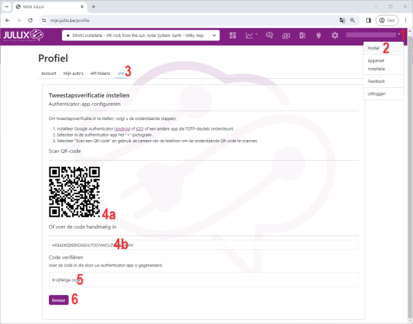 Je kiest het tabblad 2FA (3) op je profiel pagina. Je opent vervolgens de Authenticator app op je persoonlijk toestel. In de authenticator app maak je een nieuwe sleutel aan en scan je de QR-code (4a) die wordt weergegeven of geef je de gegenereerde-code(4b) manueel in in je app. Je app zal dan een 6-cijferige code genereren die je ter bevestiging ingeeft(5). Met bewaar(6) zal de code gecontroleerd worden en zal je account beveiligd worden.