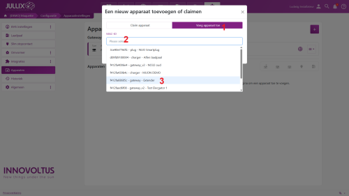 Apparaten die fysiek geïnstalleerd zijn moeten ook toegevoegd worden aan de installatie op het portaal. In eerste instantie is dat de Jullix, maar ook de andere apparaten moeten op dezelfde manier toegevoegd worden. Een apparaat (Jullix, extender, enz) aan de installatie toevoegen gebeurt in 2 stappen. Eerst moet je op het portaal van de installatie via de configuratie (1), bij Apparaten (2) het apparaat claimen. Dit doe je door bij Claim apparaat bij MAC-id het ID in te geven van het apparaat (3) bij POP-code(4) geef je de code in die je terug vindt op de stikker. Door te klikken op het plusteken(5) wordt het MAC-ID en de POP-code gecontroleerd en is het apparaat geclaimd.