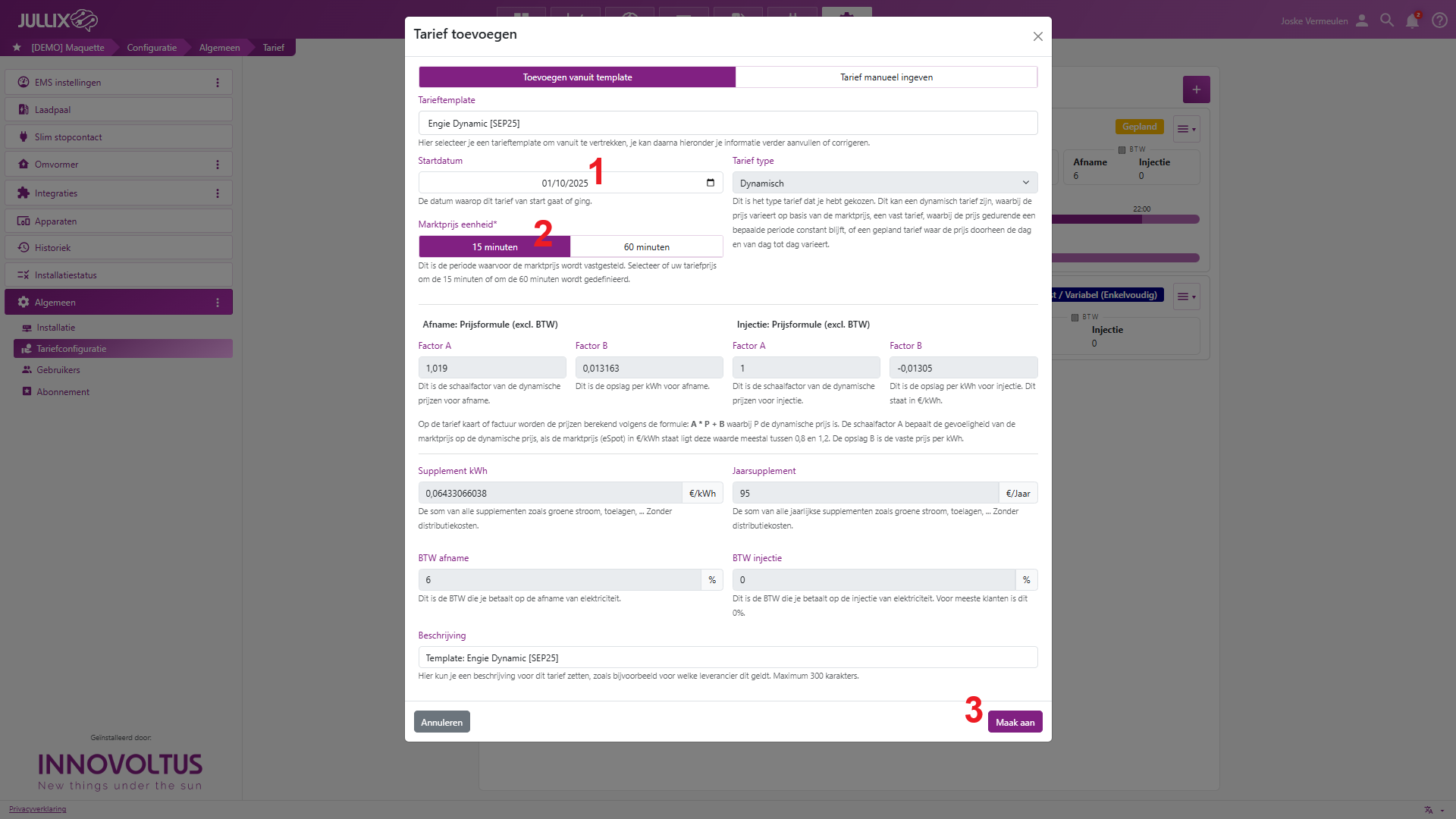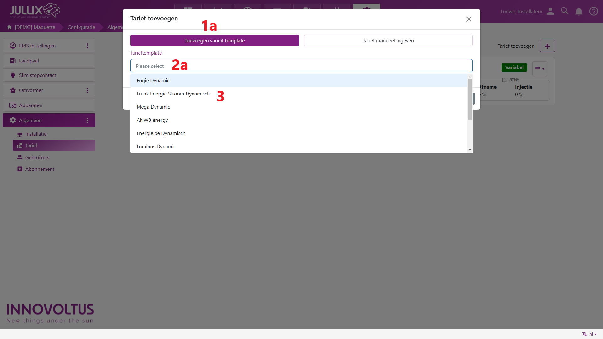 Heb je een dynamisch contract dan kies je Toevoegen vanuit template (1a) en selecteer (2a) je de template van je dynamisch energie contract (3) dit in de lijst. Daarmee worden de kosten en vergoeding automatisch vastgelegd.