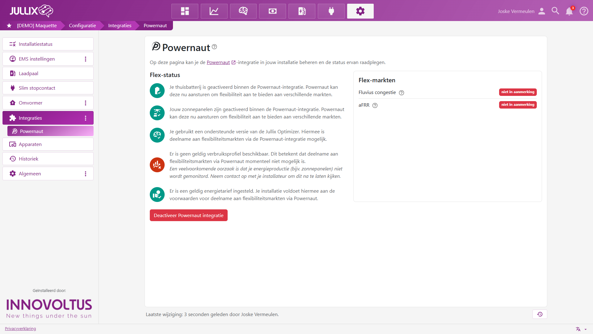 Als je de Powernaut integratie hebt geactiveerd krijg je onmiddellijk een zicht op de Flex-status. Je krijgt te zien met welke assest je kan deel nemen en welke niet. Er zal getracht worden om een verbinding te maken met het Powernaut platform. Als ook je EAN nummer correct ingeven zal van zodra er ook effectief een verbinding is met het Powernaut platform dit weergeven en zal je da in de Actuele status zien.