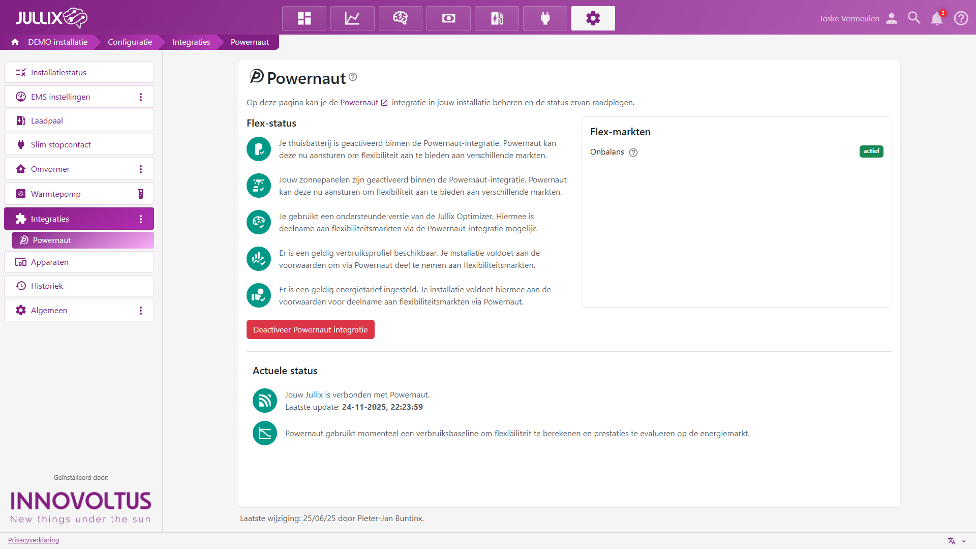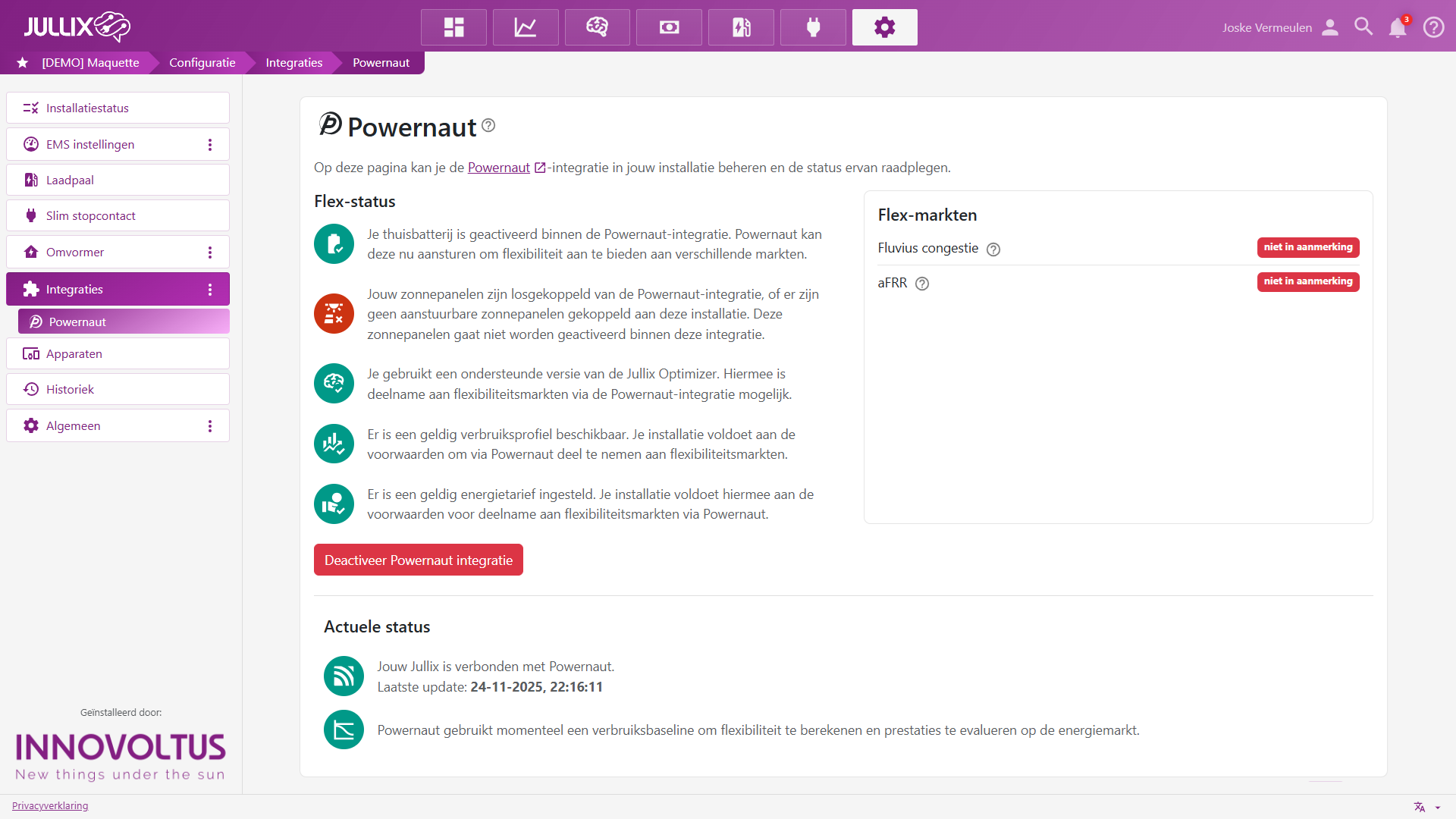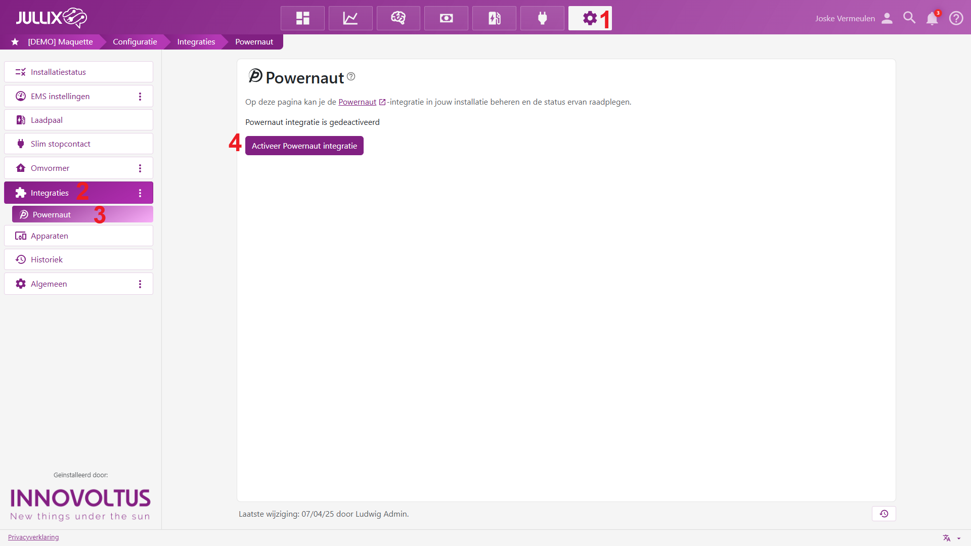 Integraties (2) kan je de Powernaut (3)-integratie instellen en monitoren.