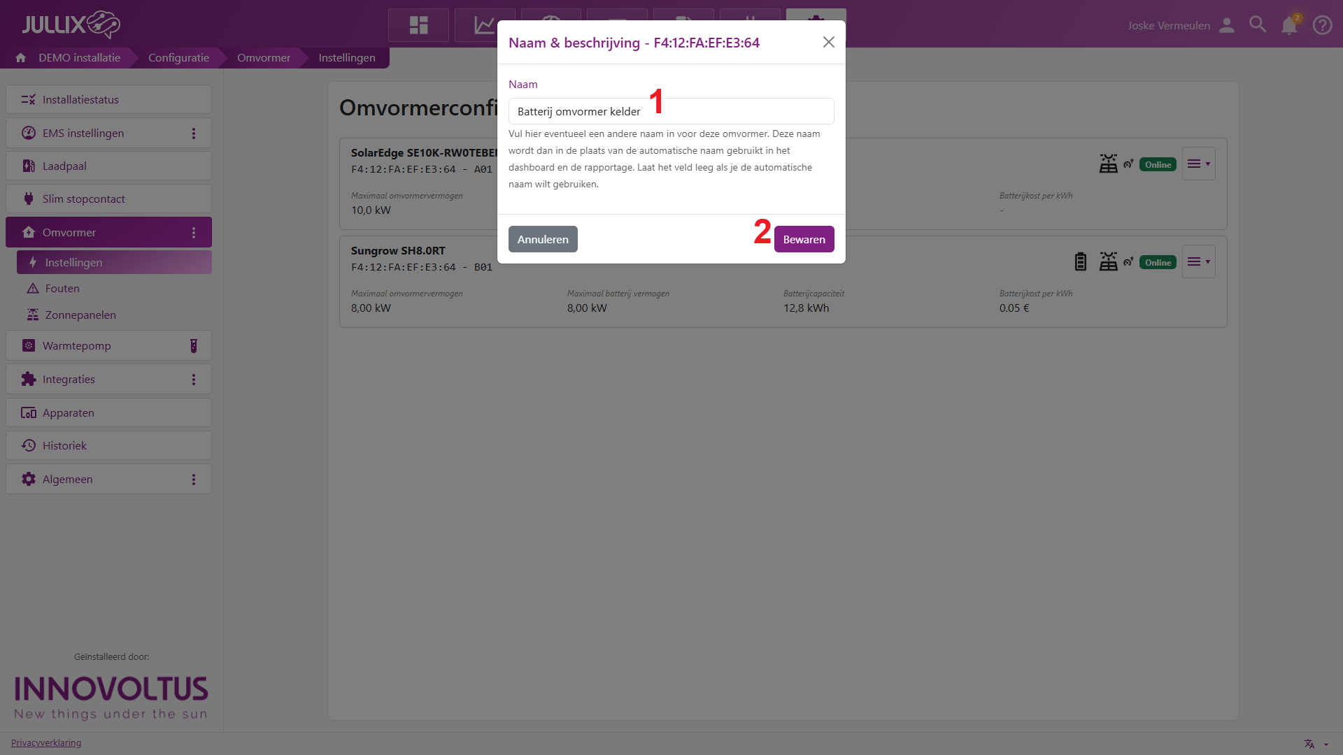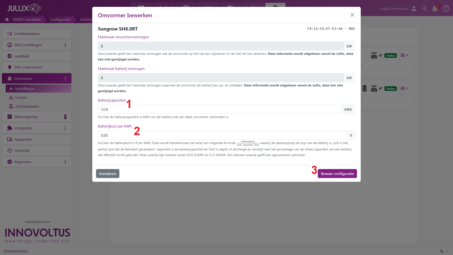 Afhankelijk van het type omvormer kan je enkele parameters aanpassen die de energieregeling van je installatie beïnvloeden. Deze pagina bereik je via Configuratie (1) van de installatie, onder de sectie