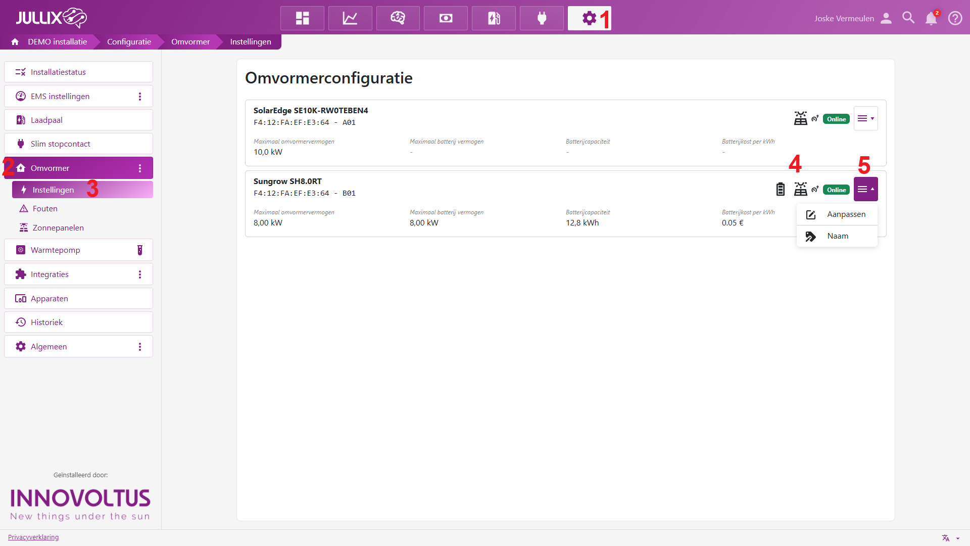 Je krijgt een lijst van de geconnecteerde omvormers, aan de icoontjes bij iedere omvormer (4) zie je de functies van de omvormer.