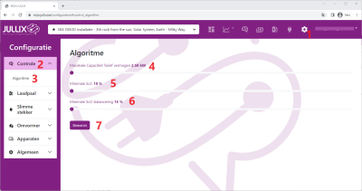 Je kan een aantal parameters instellen die de energieregeling van je installatie beïnvloeden. Deze pagina bereik je via settings Configuratie(1) van de installatie, onder de sectie Controle(2) bij Algoritme(3).